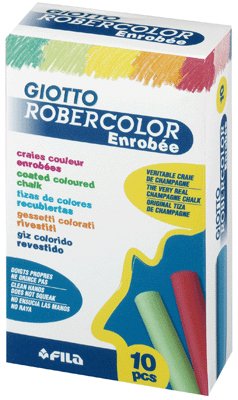 Boîte de 10 craies enrobées coloris assortis. Véritables craies de champagne. Omyacolor Enrobée est actuellement la craie la mieux adaptée aux exigences du public et de l'enseignement. Son traitement spécial mis au point par le laboratoire de recherche Omyacolor, permet notamment grâce au pelliculage, une prise en main, sans le moindre dépot de poussière. Les doigts restent propres, le touché est plaisant, similaire à celui d'un stylo. L'écriture est très douce, d'une constante qualité. L'effaçage à sec est instantané et complet. Les couleurs pigmentées est l'excellent pouvoir couvrant permettent également d'employer cette craie d'art pour des applications pédagogiques.