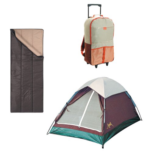 Ce lot pour campeur est composé d'une tente 2 places, de 2 tapis de sol et de 2 sacs de couchage. Le tout est livré dans un sac équipé de roulettes et muni d'une poignée escamotable.